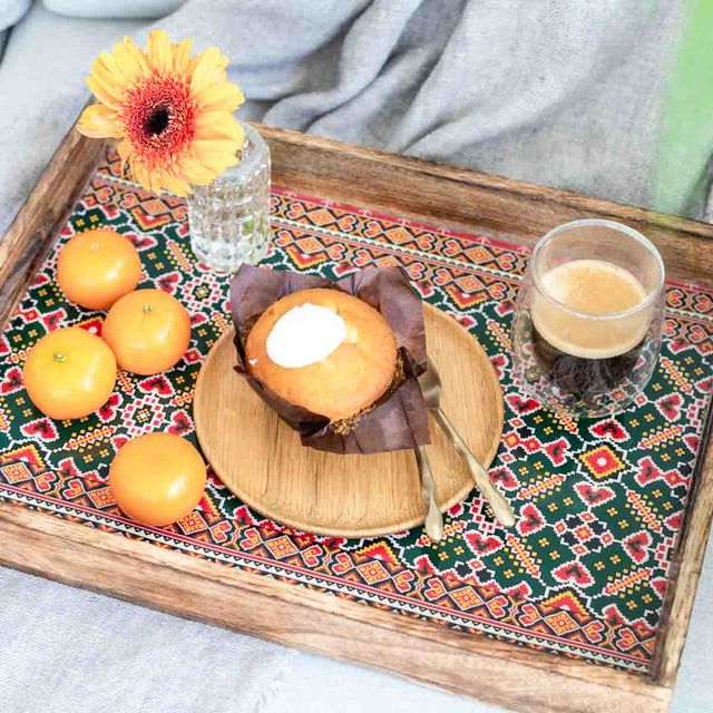 Celebrate timeless beauty with this cake stand, featuring a digitally printed enamel inlay inspired by Mughal floral motifs. The repeating lotus pattern in soft pinks and greens evokes elegance, heritage, and charm—perfect for both festive occasions and everyday indulgence. Made with rich mango wood, this pedestal stand adds warmth and artisanal character to your spread. Whether you're hosting an al fresco picnic, a cozy brunch, or a festive gathering, the matching server—makes for a stunning centerpiece and a thoughtful gift. Note: Each product is unique and slight contrasts may appear from one product to another. Care Instructions: Not microwave or...